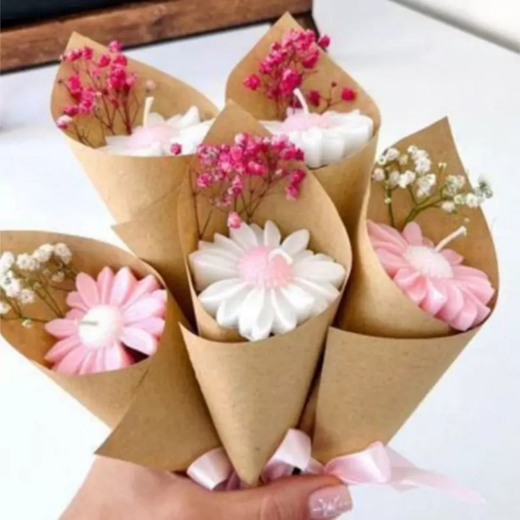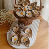 گیفت دسته گل بابونه تزیین شده با کاغذ کرافت و گل ژیپسوفیلا فوقالعاده شیک و ترند مخصوص مجالس عقد و عروسی